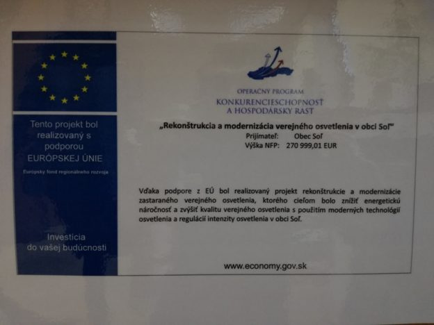 V rámci Operačného programu: Konkurencieschopnosť a hospodársky rast, prioritná os 2: Energetika, ktorý je spolufinancovaný Európskym fondom regionálneho rozvoja obec Soľ realizuje projekt s názvom “Rekonštrukcia a modernizácia verejného osvetlenia v obci Soľ“.