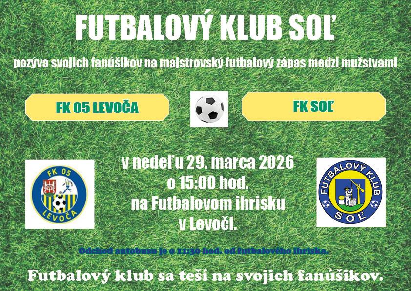 Futbalový klub Soľ Vás pozýva na majstrovský futbalový zápas v nedeľu 29. marca 2026 o 15:00 hod. medzi mužstvami FK 05 Levoča a FK Soľ. Odchod autobusu je o 11:30 hod. od futbalového ihriska.