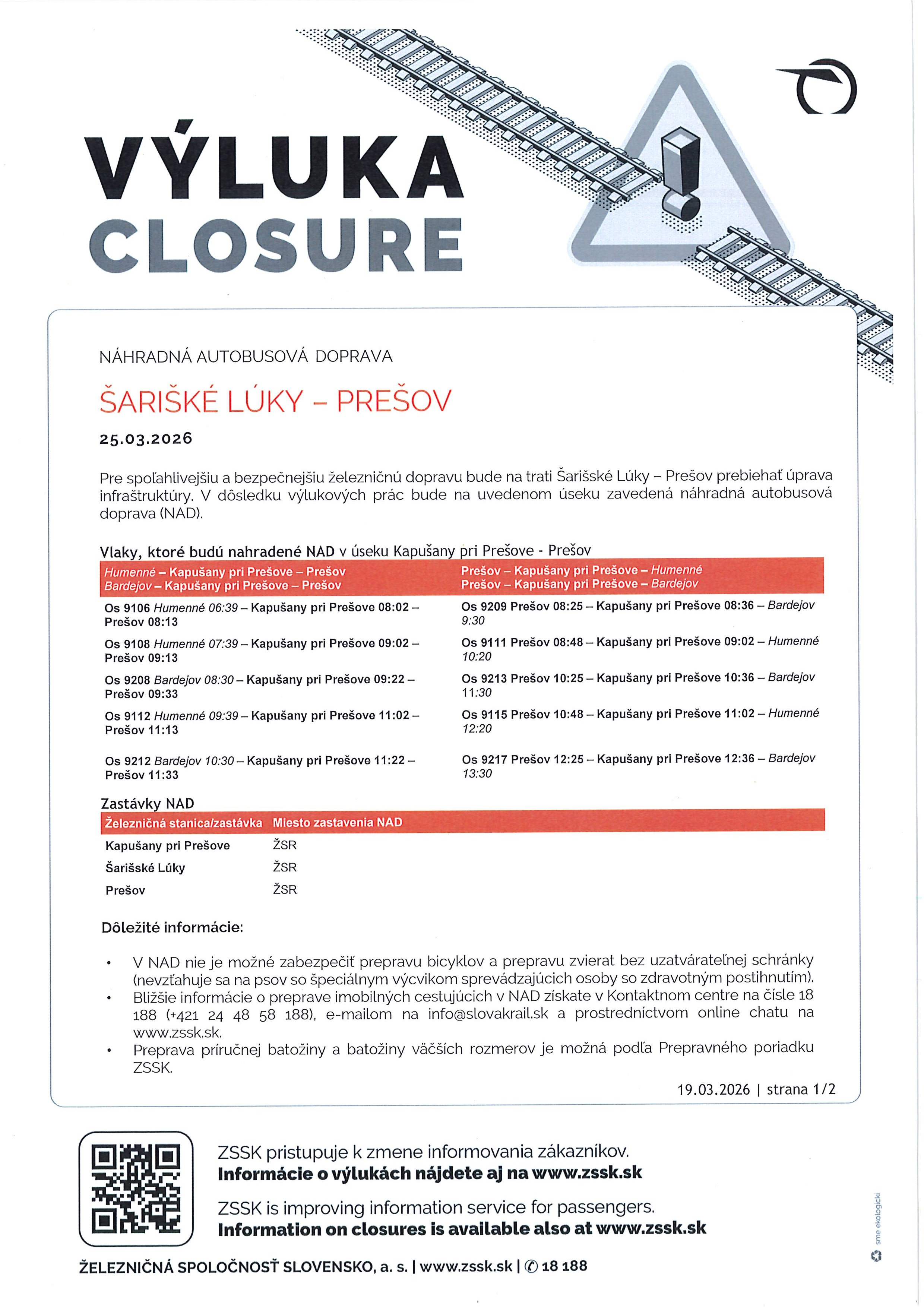 • Výluka vlakov na trati Šarišské Lúky - Prešov